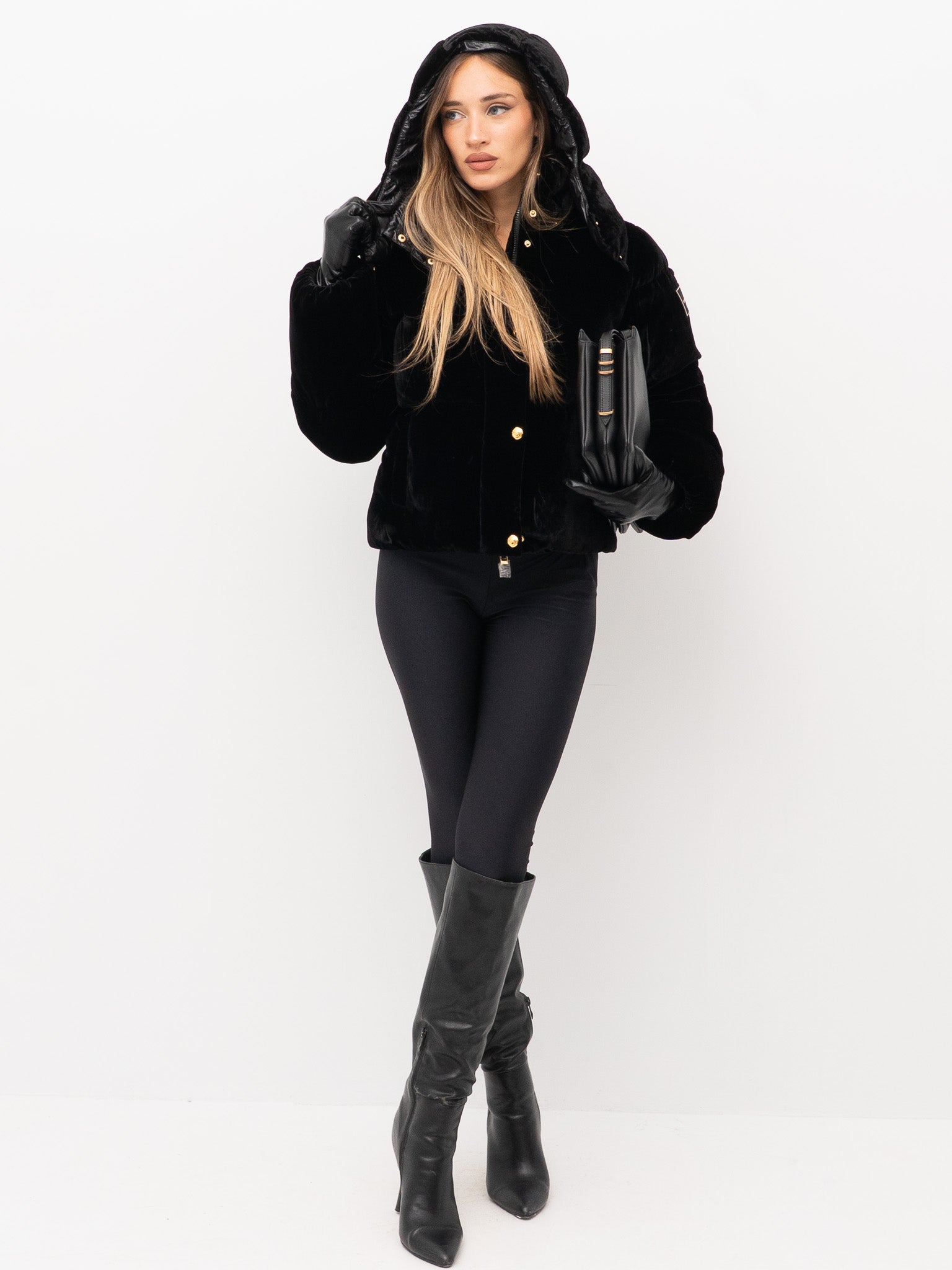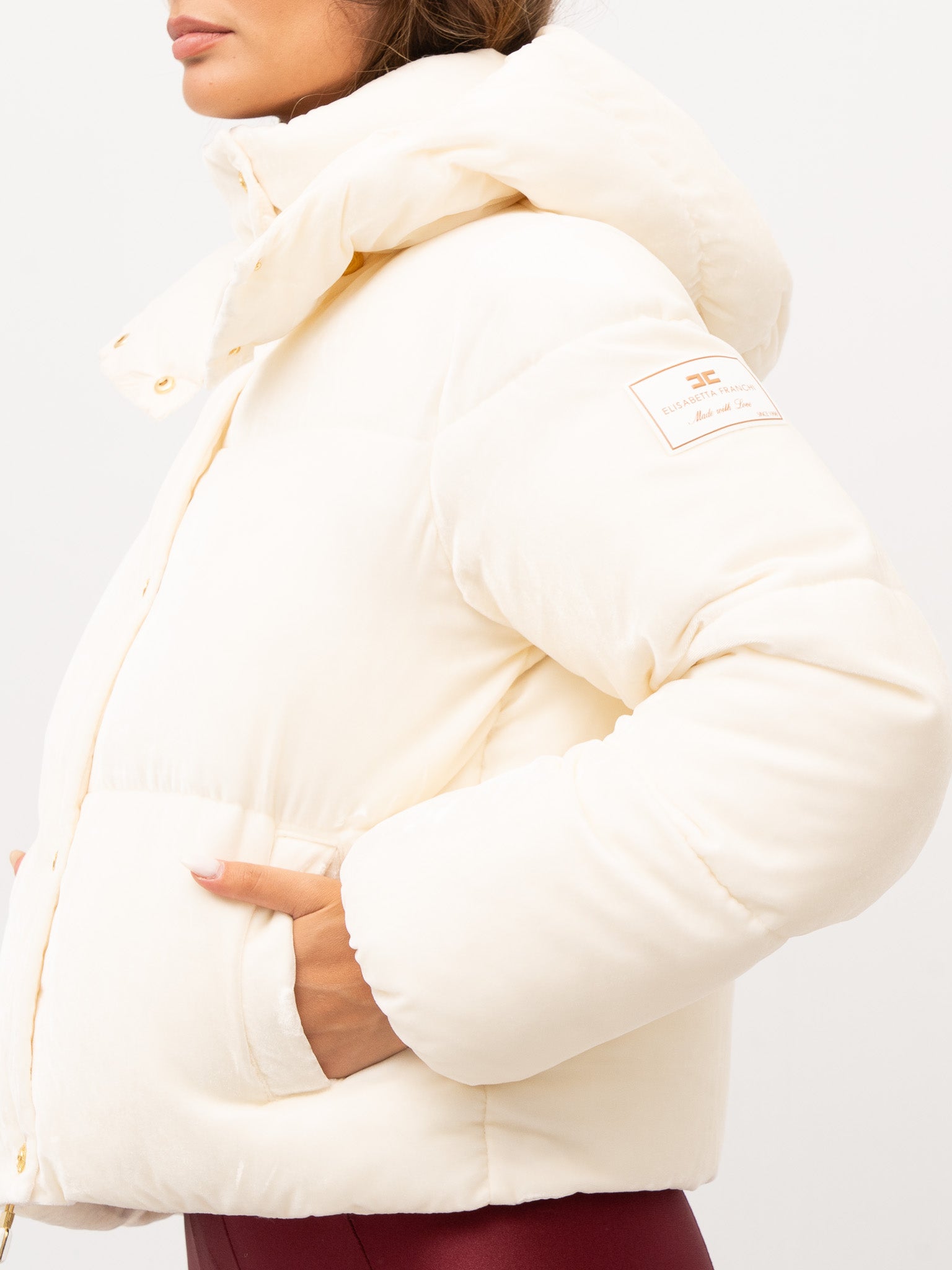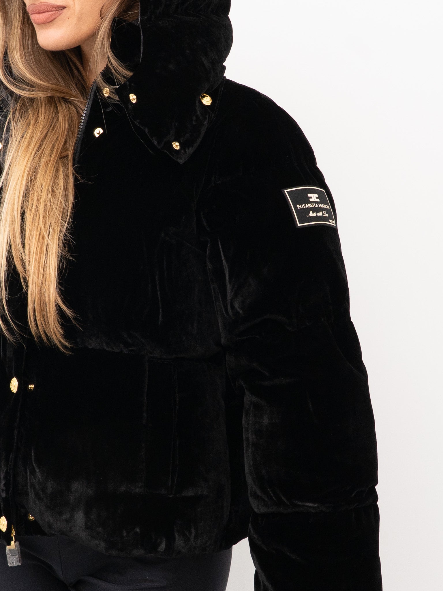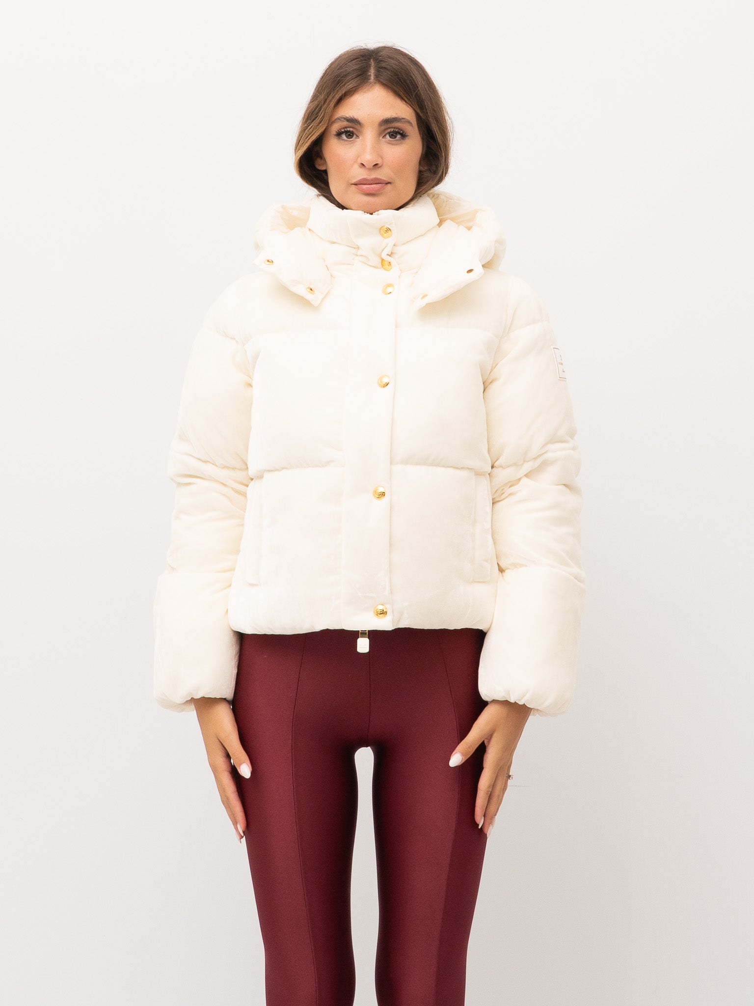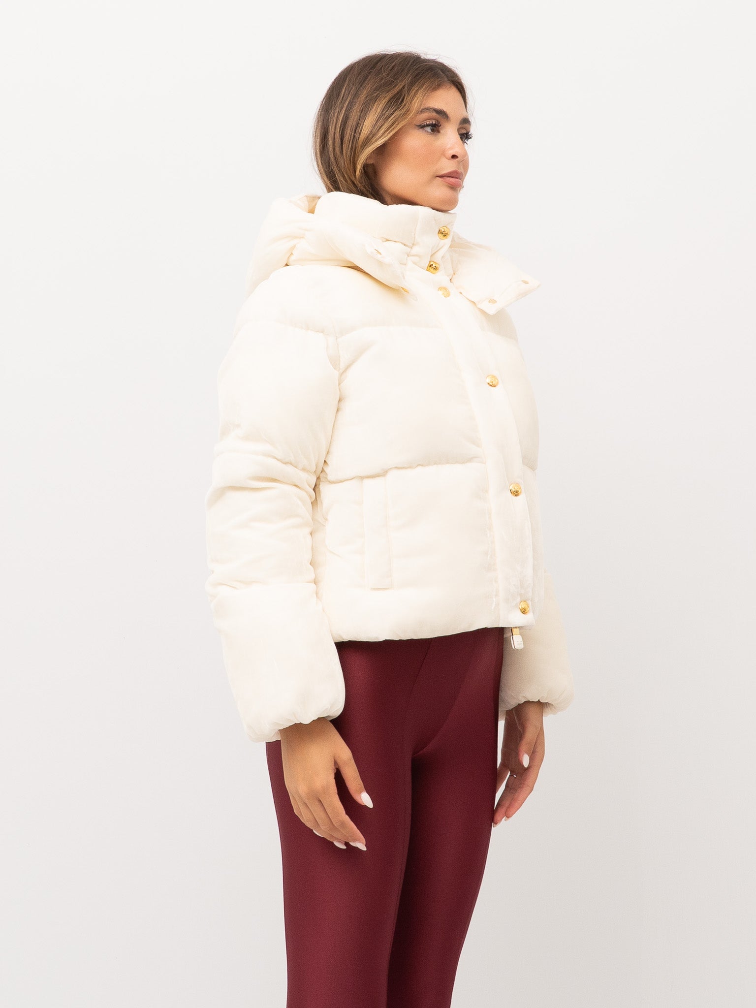 dettagli: imbottitura trapuntata, chiusura con zip e bottoni automatici a pressione in metallo dorato, tasche frontali applicate, cappuccio fisso con bottoni decorativi
