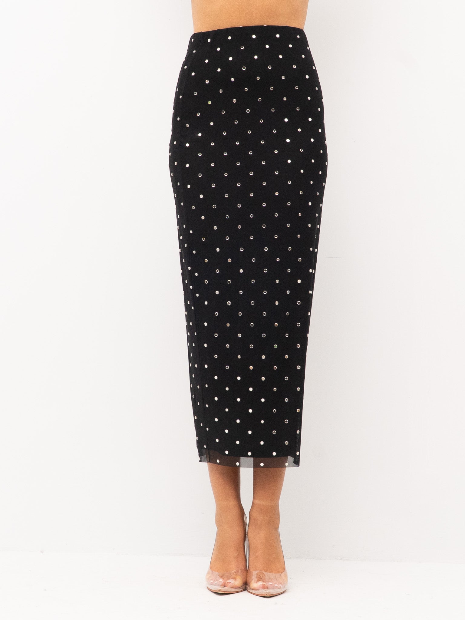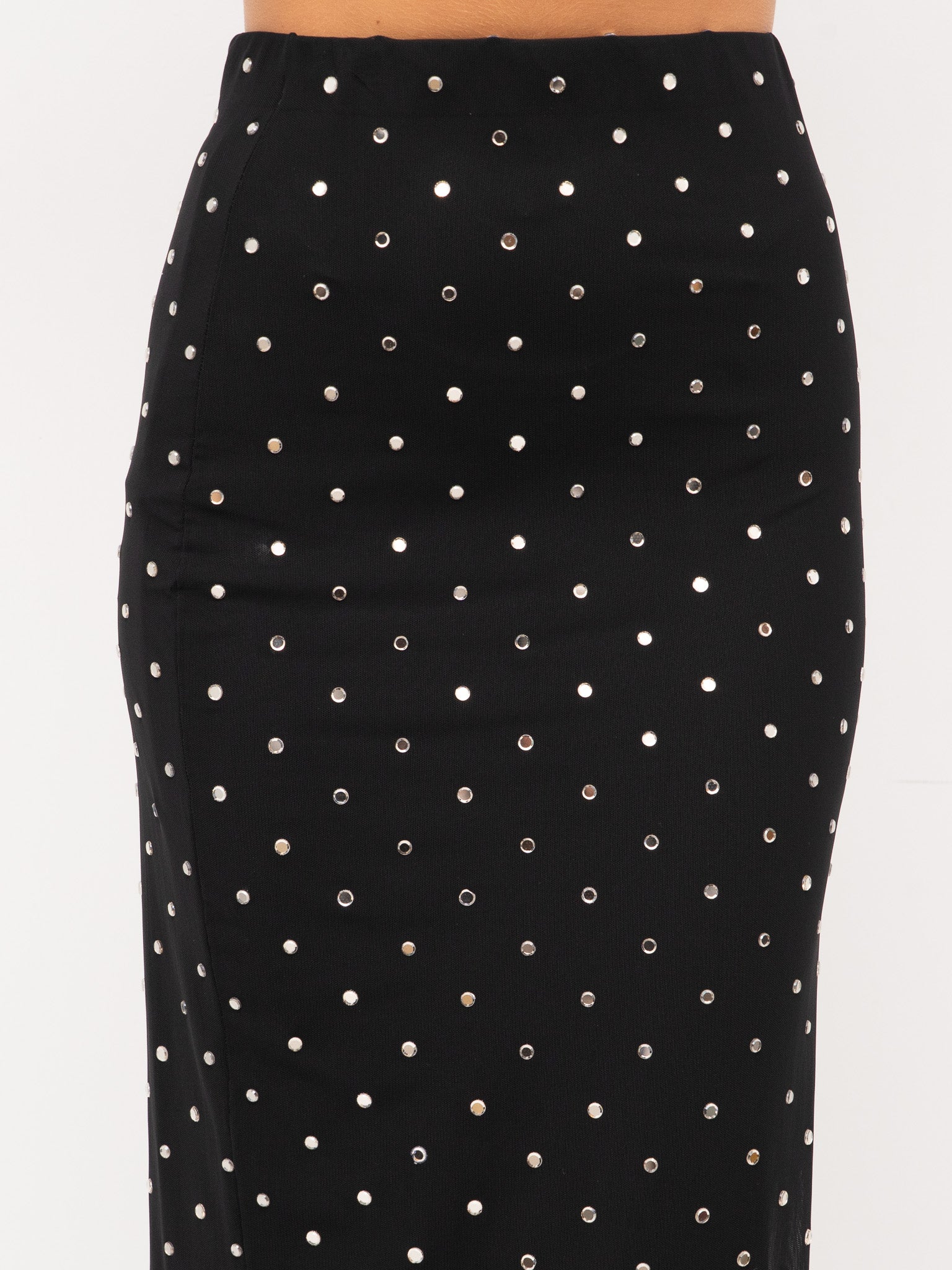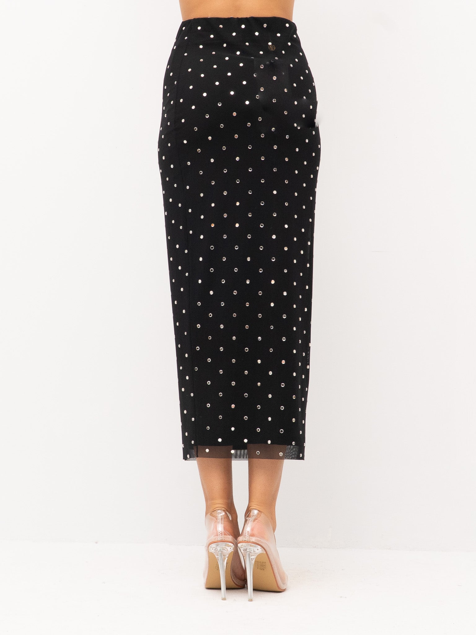 dettagli: applicazioni di micro strass su tutta la superficie, tessuto leggermente elasticizzato, cucitura posteriore con spacco sul fondo, fodera interna