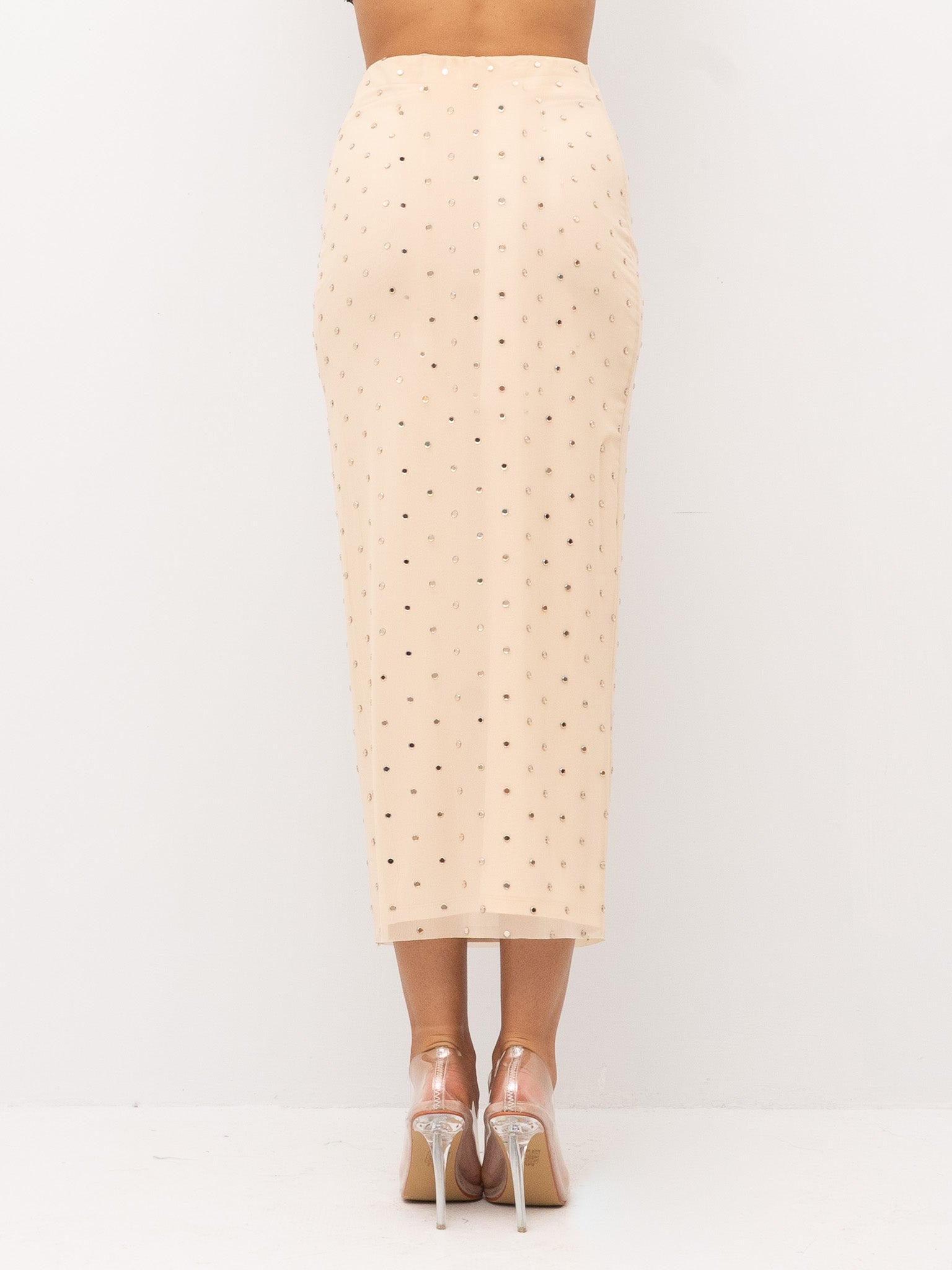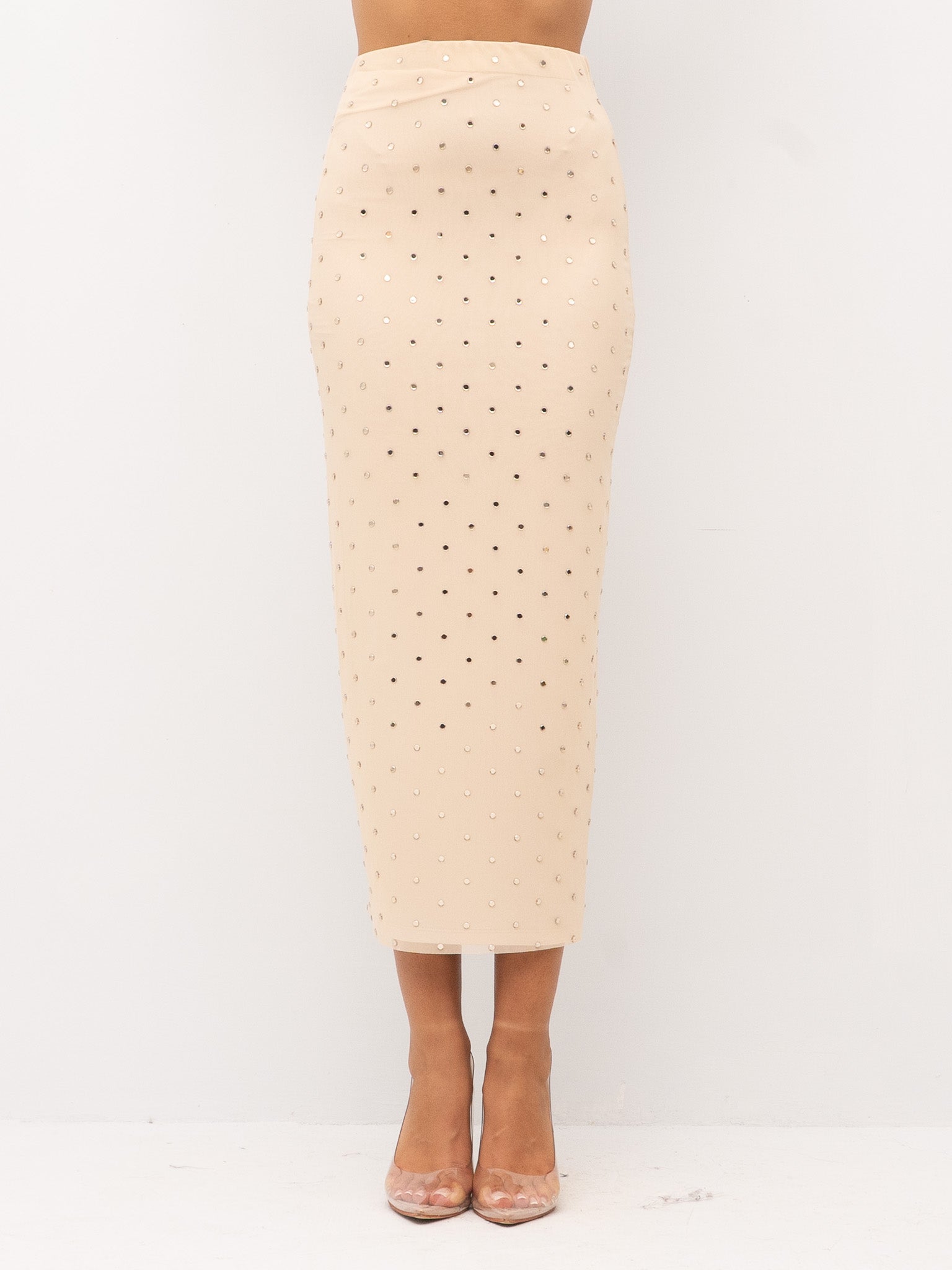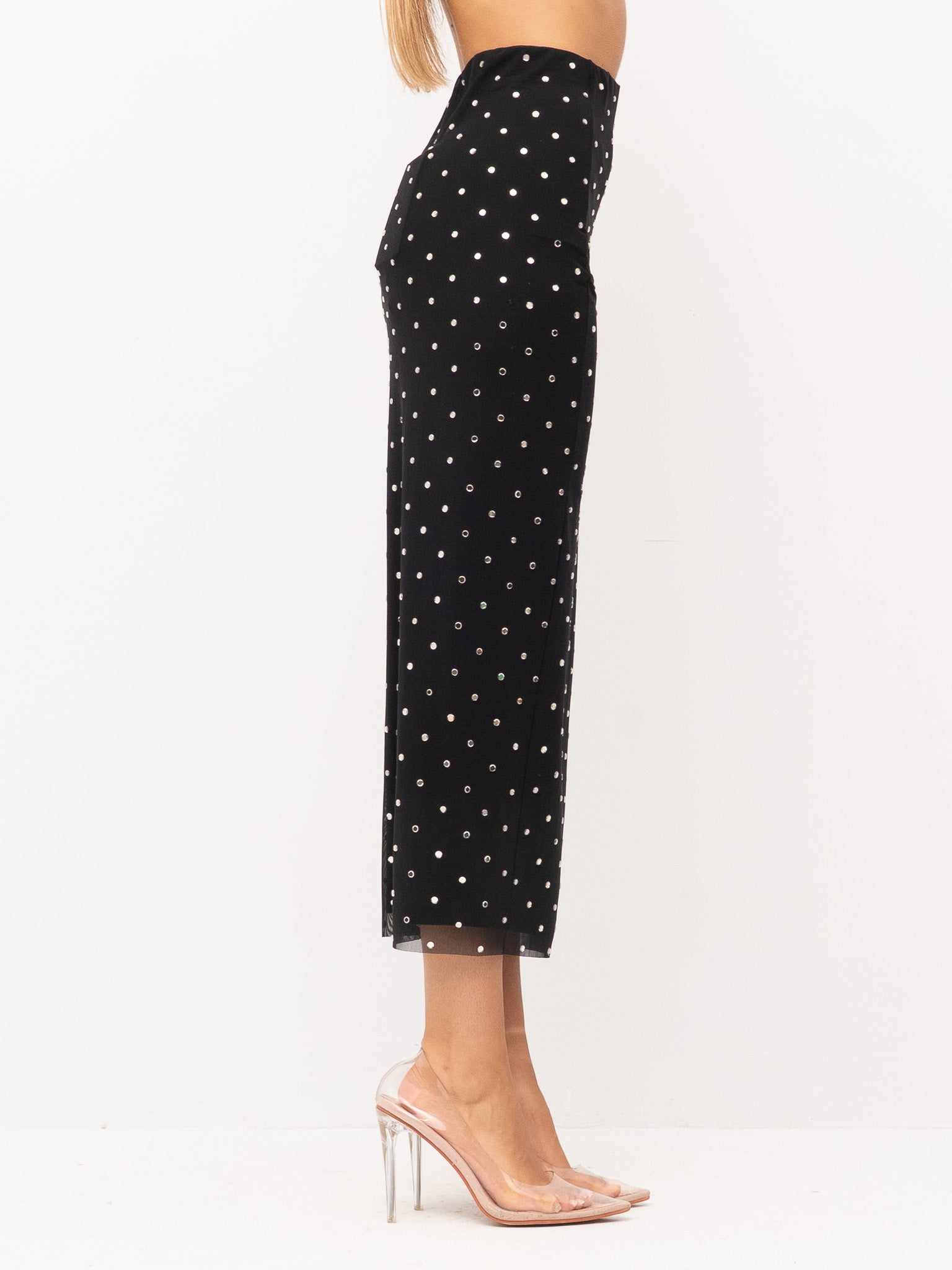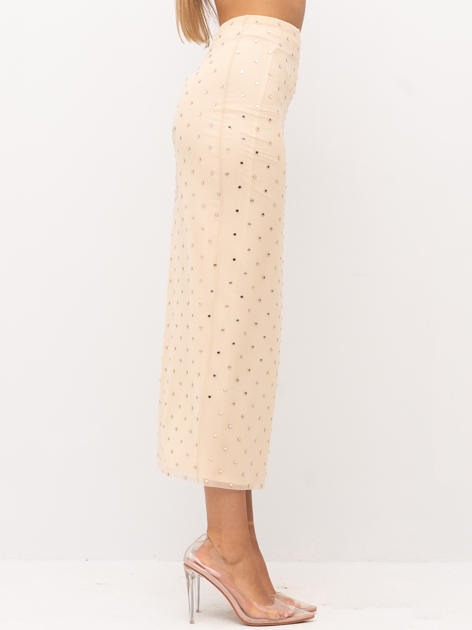 dettagli: applicazioni di micro strass su tutta la superficie, tessuto leggermente elasticizzato, cucitura posteriore con spacco sul fondo, fodera interna