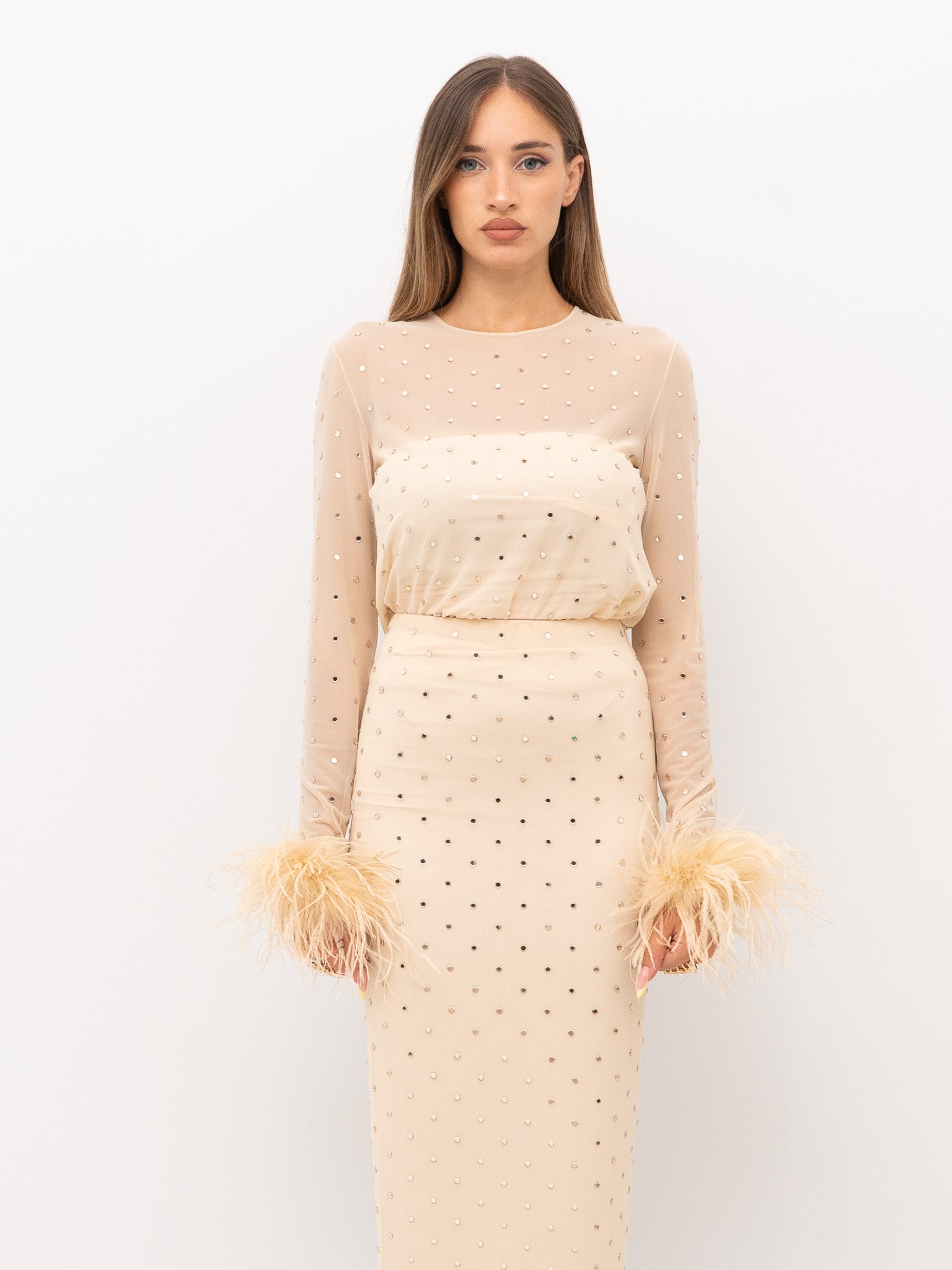 dettagli: applicazioni di micro strass su tutta la superficie, polsi arricchiti da piume rimovibili, tessuto leggermente trasparente, fodera interna, chiusura posteriore a goccia con bottone