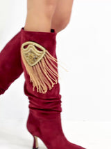 dettagli: realizzato in morbida pelle scamosciata, impreziosito da applicazione gioiello laterale con frange a catena dorate, struttura morbida con arricciatura naturale lungo il gambale, tacco sottile rivestito