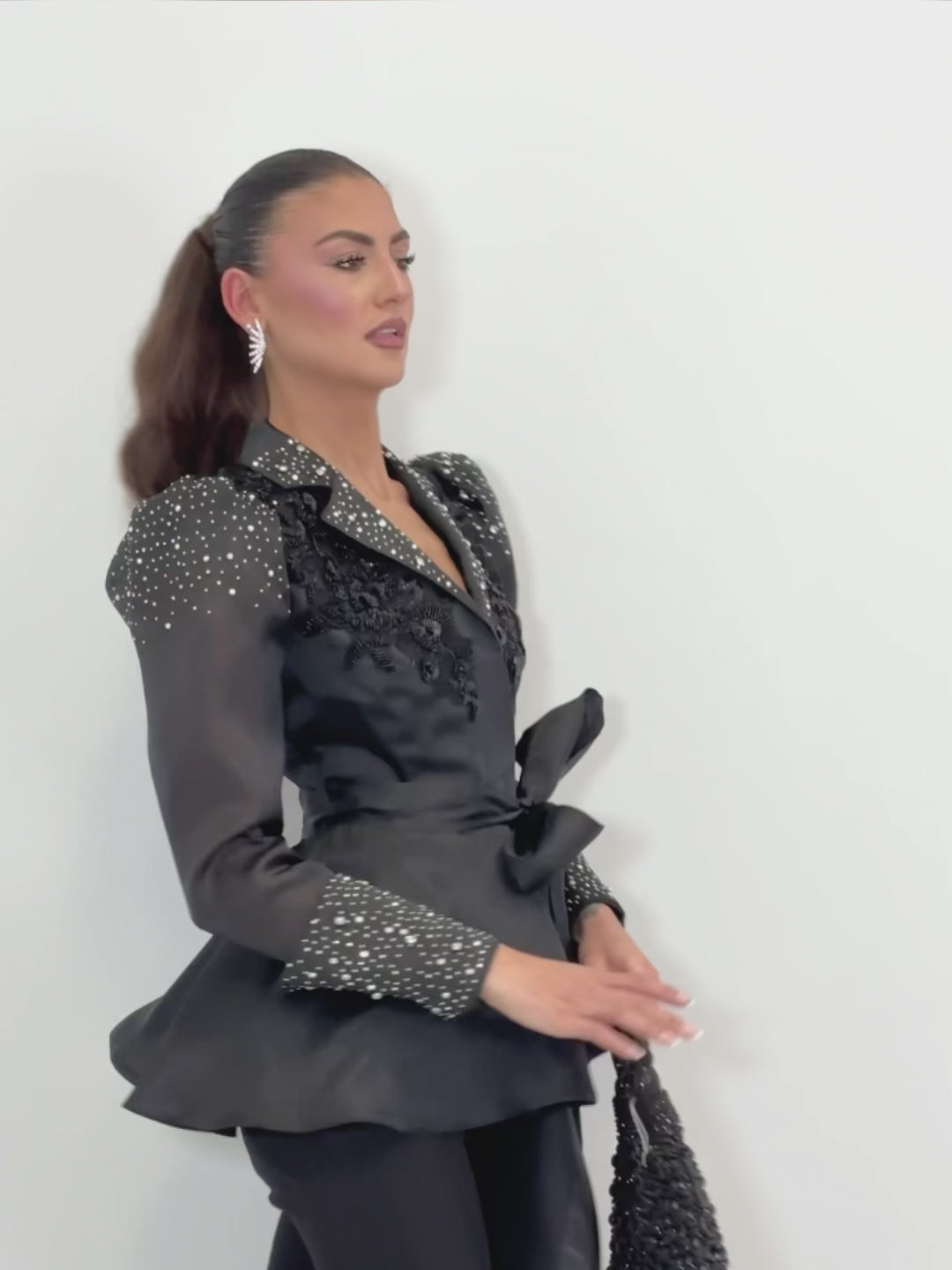 dettagli: tailleur composto da giacca con applicazioni decorative e lavorazioni ricamate sul davanti e sulle spalle, maniche lunghe con polsini decorati, cintura in tessuto coordinato da annodare in vita; pantalone a linea dritta con costruzione pulita, senza tasche, dal taglio essenziale ed elegante